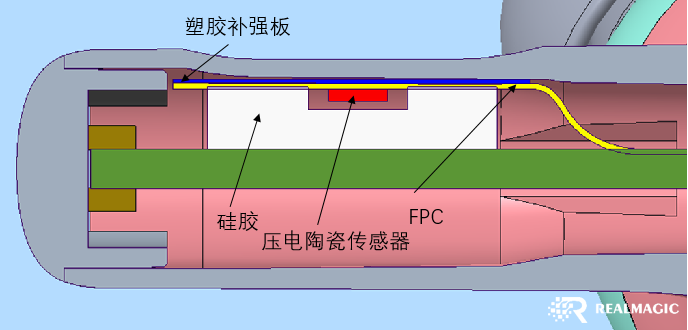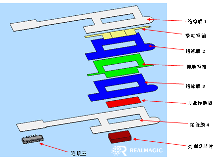 上圖為銳盟半導體RM1105A 滑動+壓感二合一方案一建議結(jié)構(gòu)圖:FPC,其壓感+滑動部分結(jié)構(gòu)組裝部分內(nèi)含塑膠補強板、硅膠、壓電陶瓷傳感器、FPC等部件。