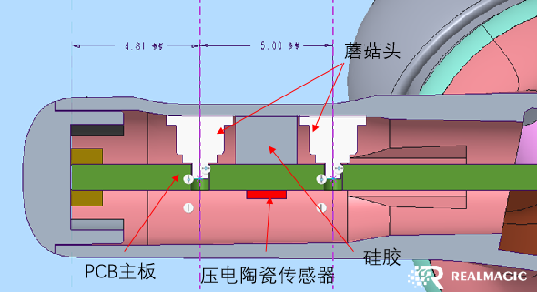該方案成本更低,其利用兩枚蘑菇頭作為滑動,同時蘑菇頭中間的硅膠將相關壓力和形變的傳導至PCB主板與傳感器,該方案優(yōu)勢在于,避免了人工組裝PCB連接器所造成的高成本。