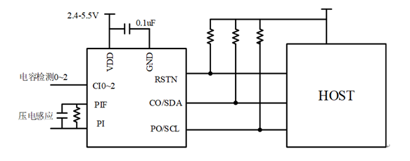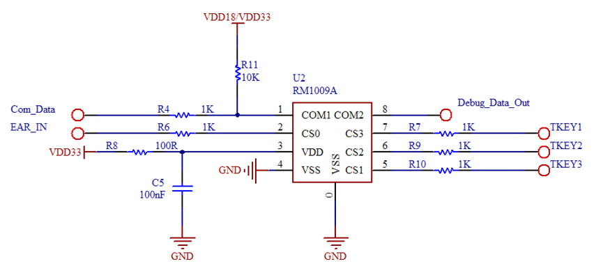 上圖為銳盟半導體RM1105A 滑動+壓感二合一應用電路示意圖。